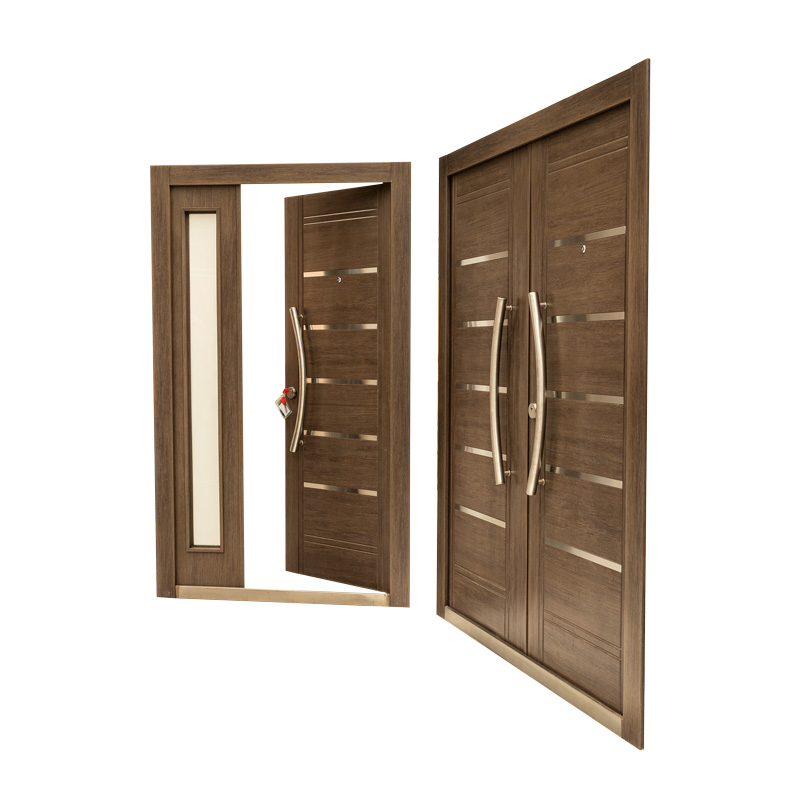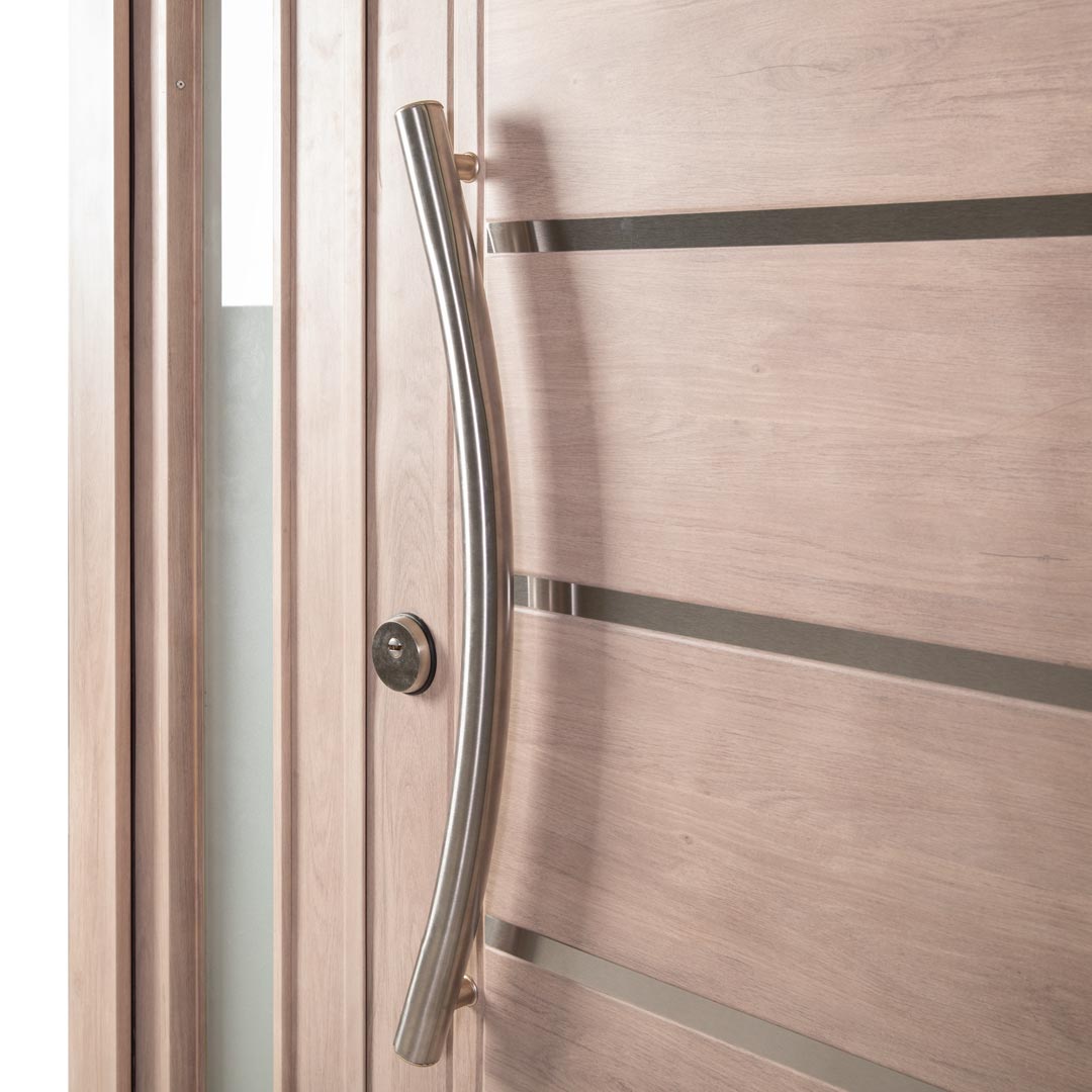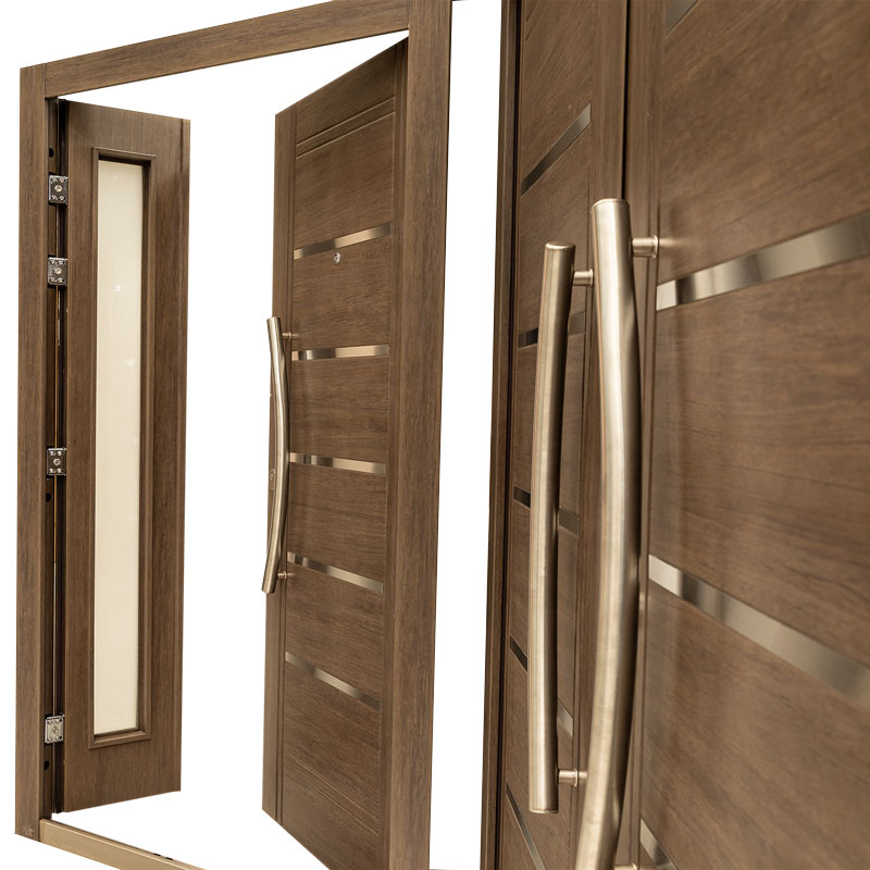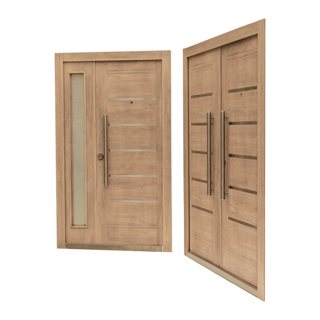 La Nueva Línea que estamos presentando cuenta con 12 modelos para su elección, seis Portadas Residenciales y seis Doble Puertas en acabados Nogal Americano o Roble Blanco, además ofrece una variedad de herrajes e insertos de acero inoxidable para todos los gustos.